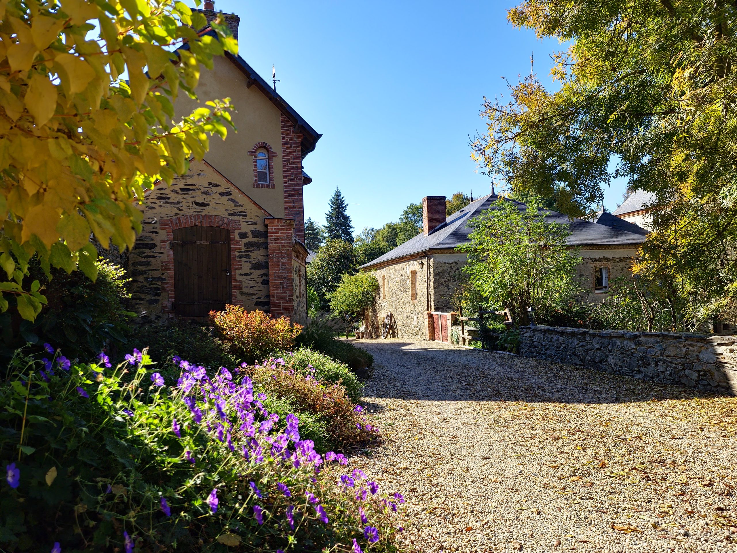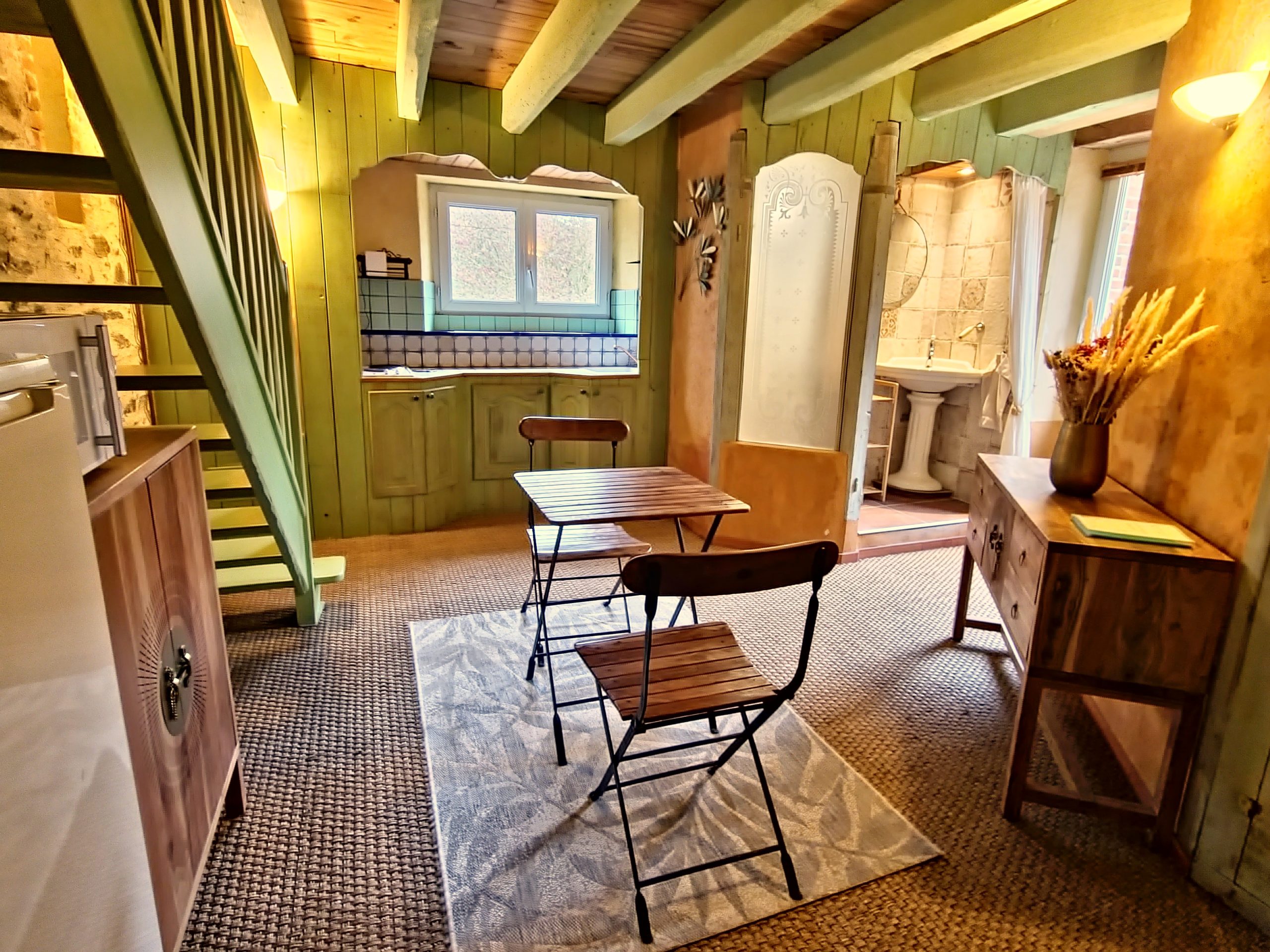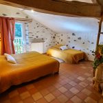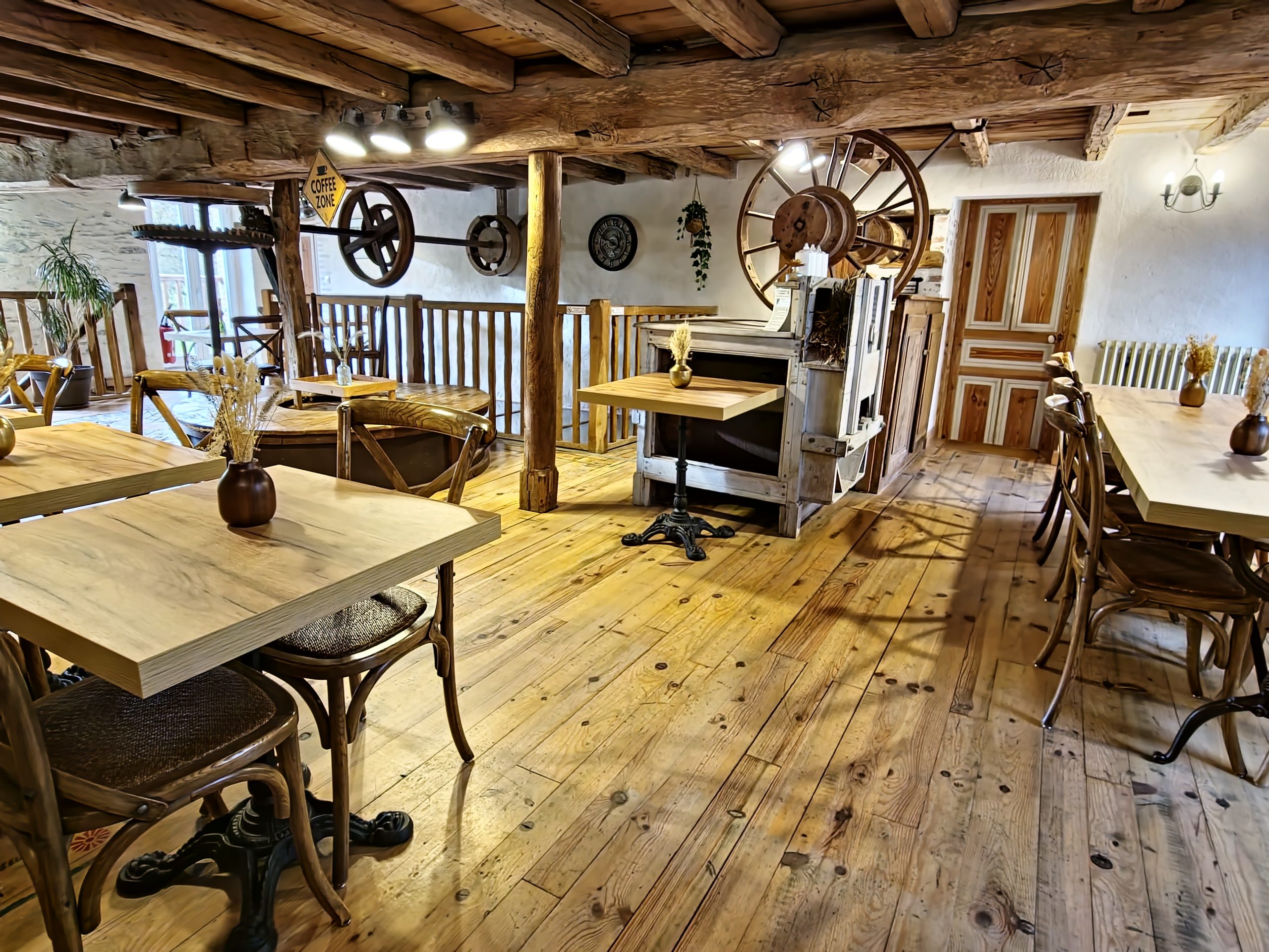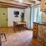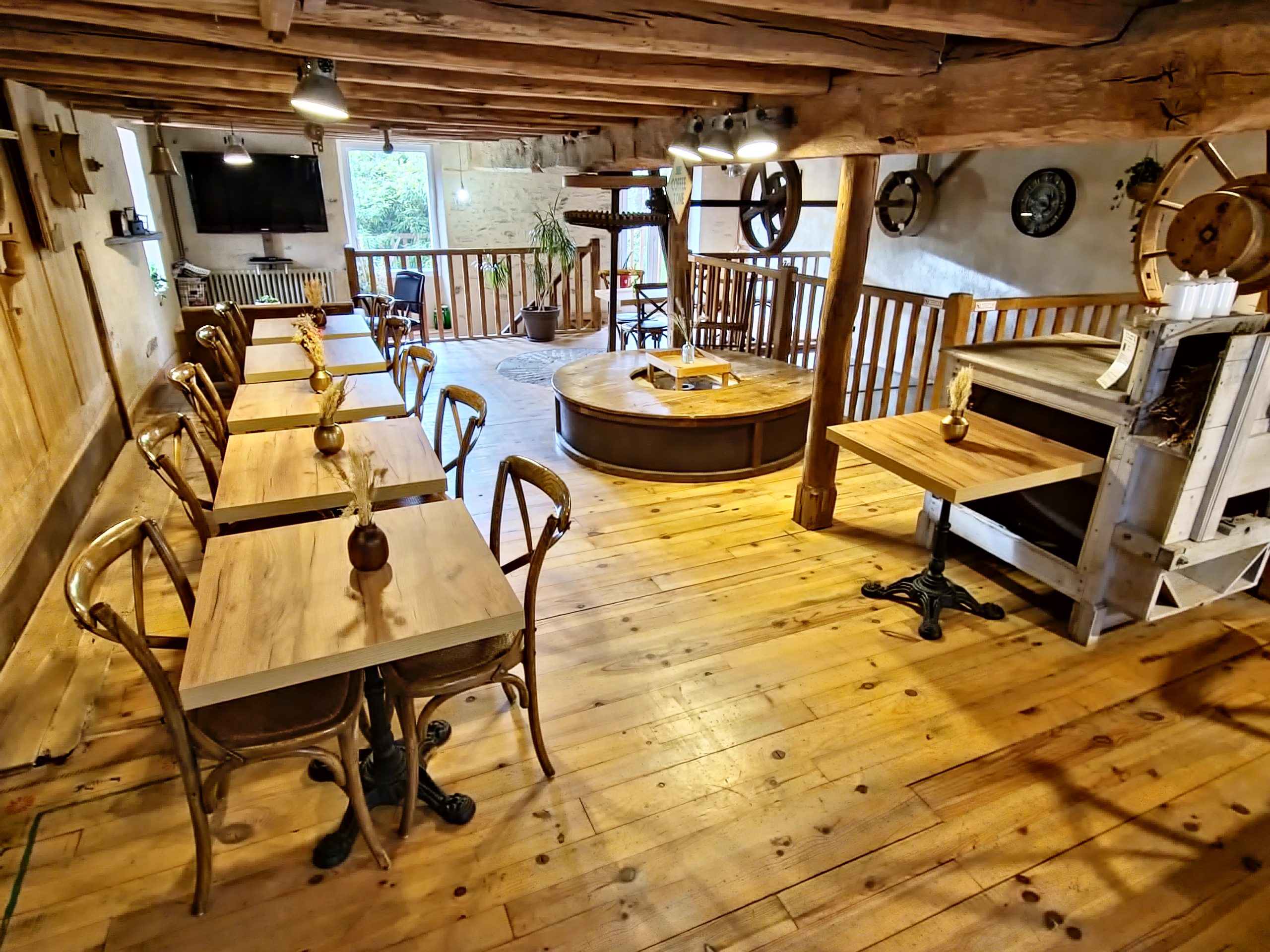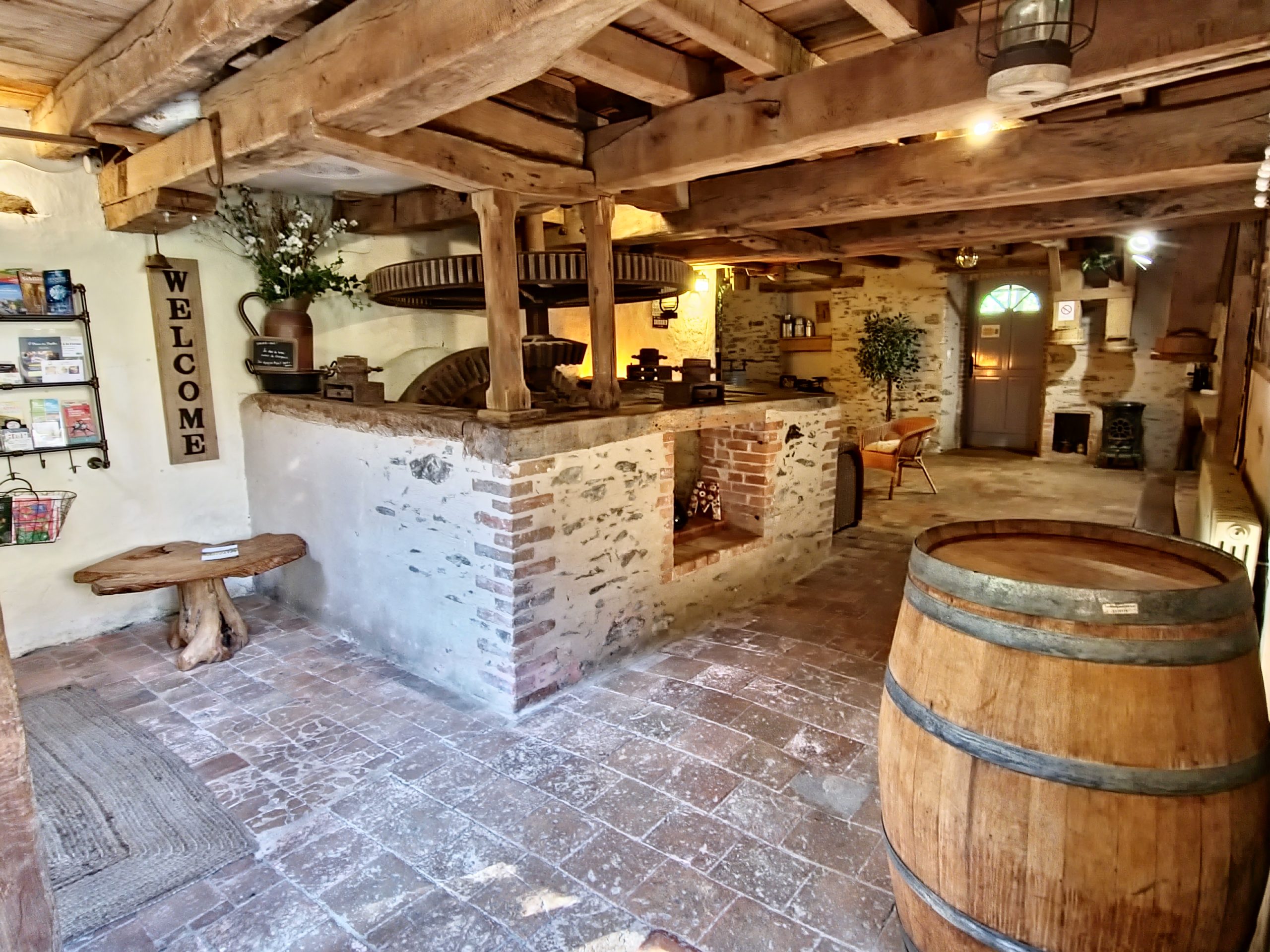 Cet ancien moulin à eau, rénové avec passion a conservé les traces de son passé – meule, trémie, bief et autres éléments participent pleinement à la décoration.