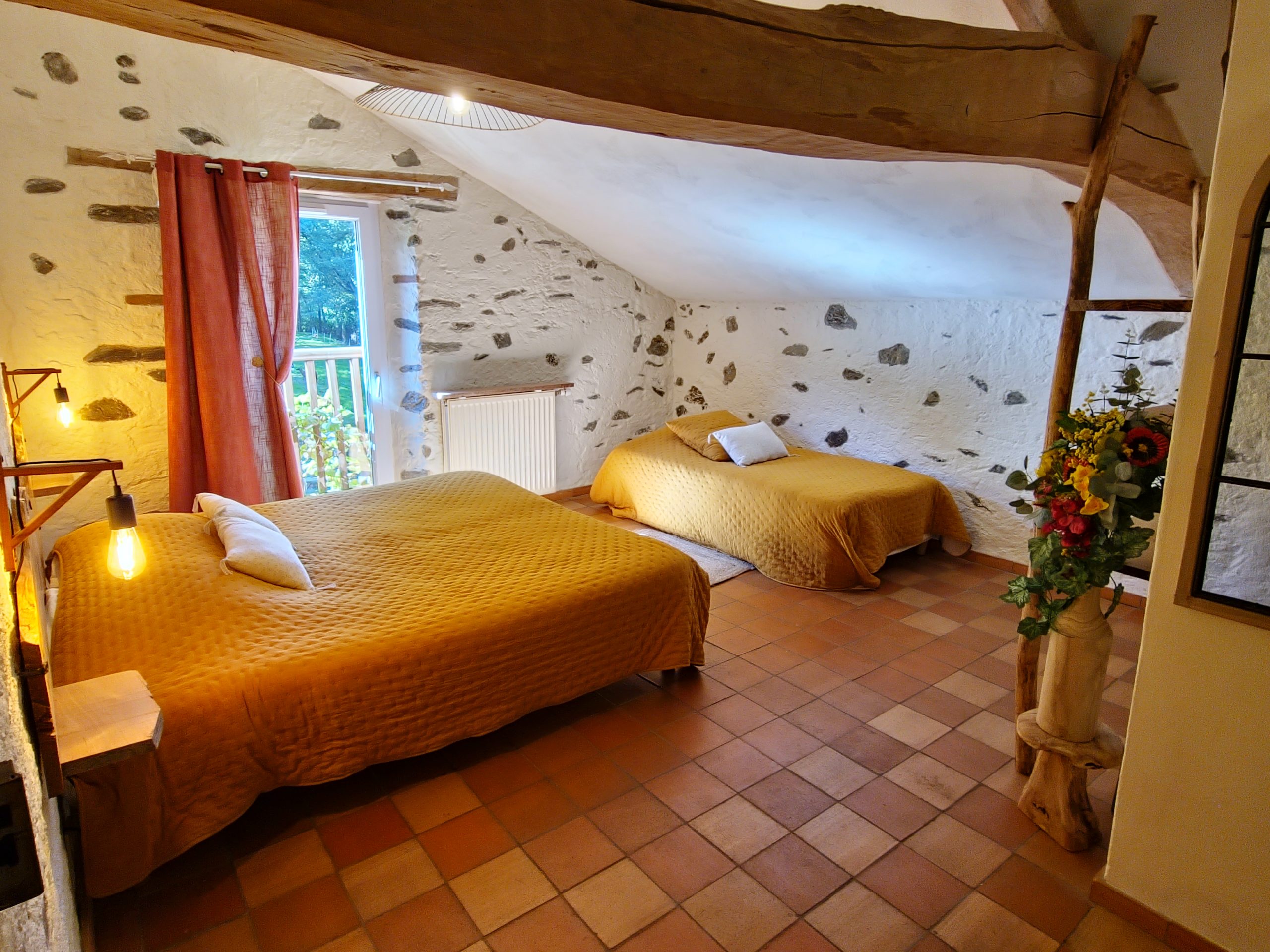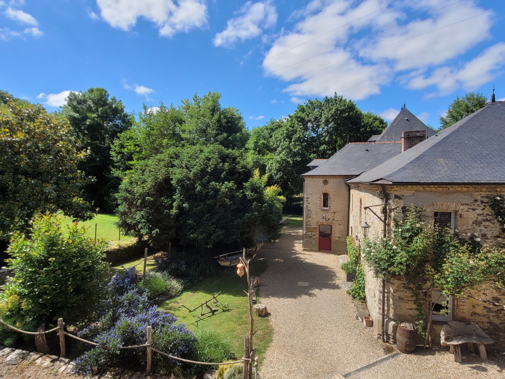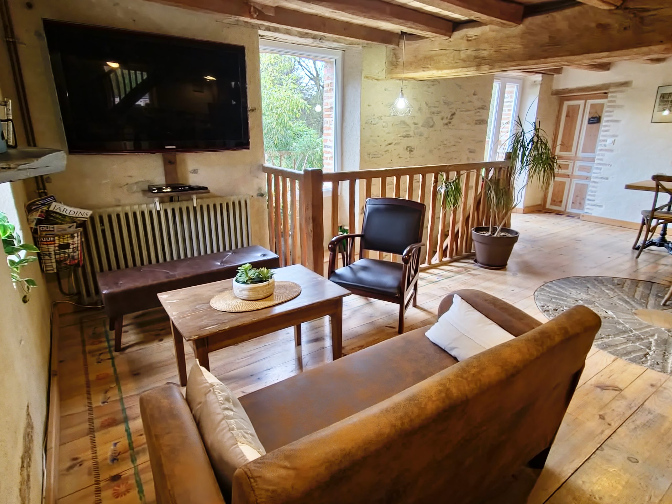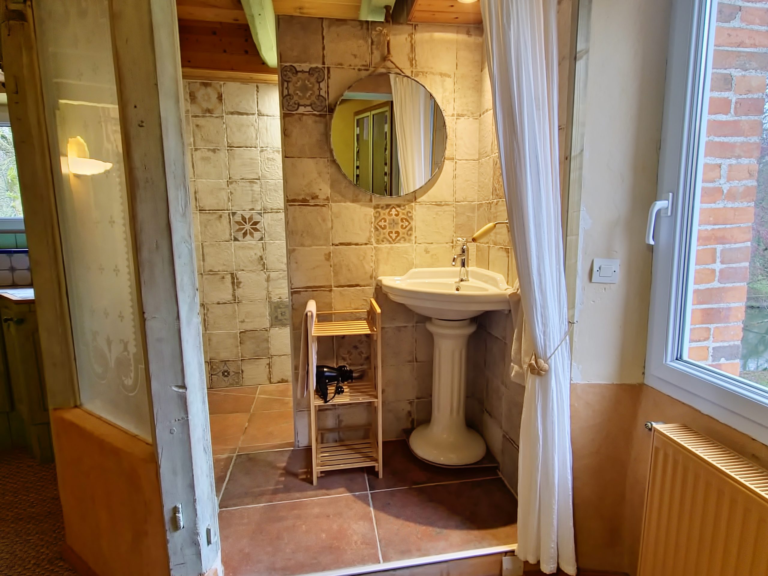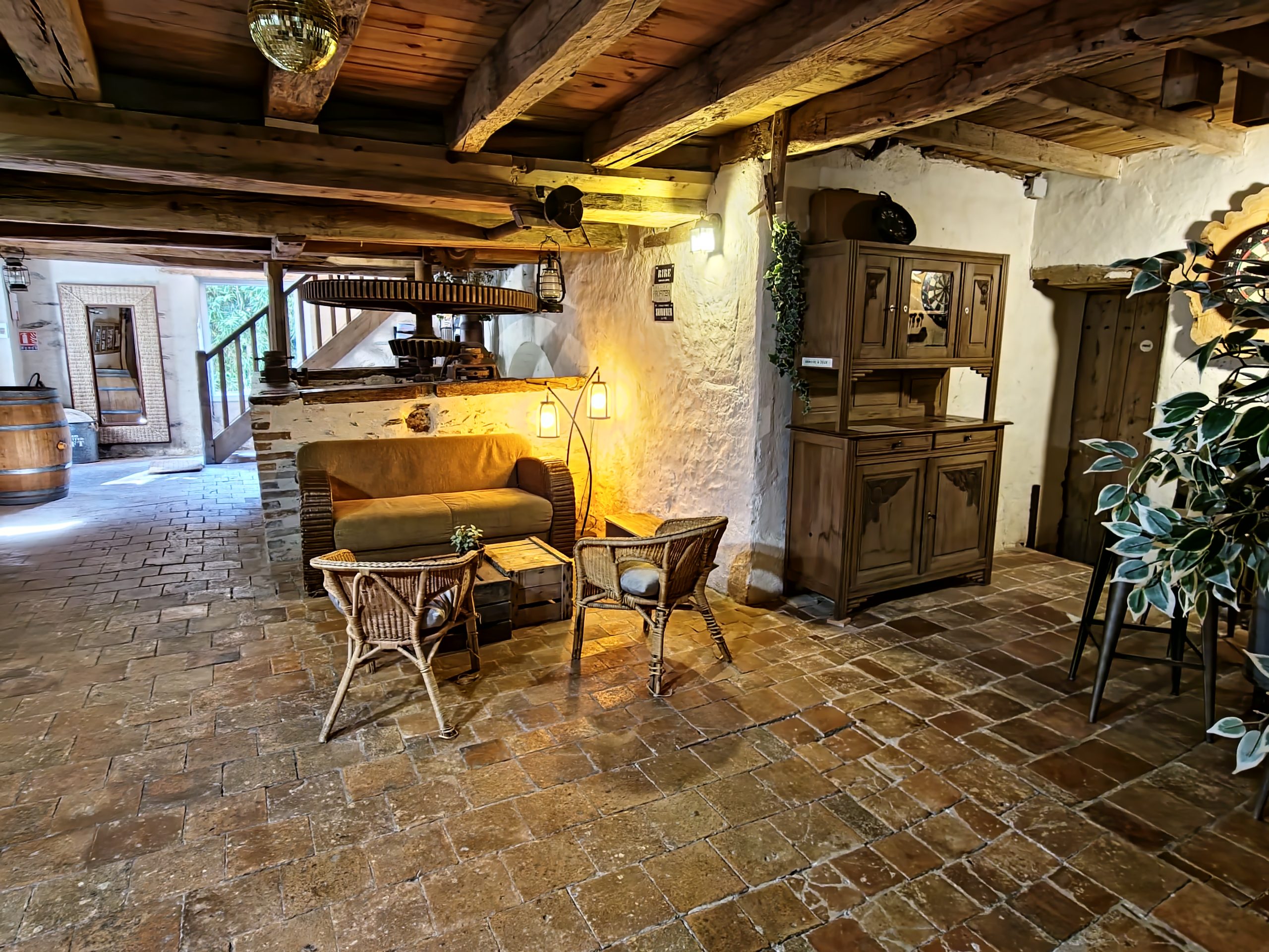 Cet ancien moulin à eau, rénové avec passion a conservé les traces de son passé – meule, trémie, bief et autres éléments participent pleinement à la décoration.