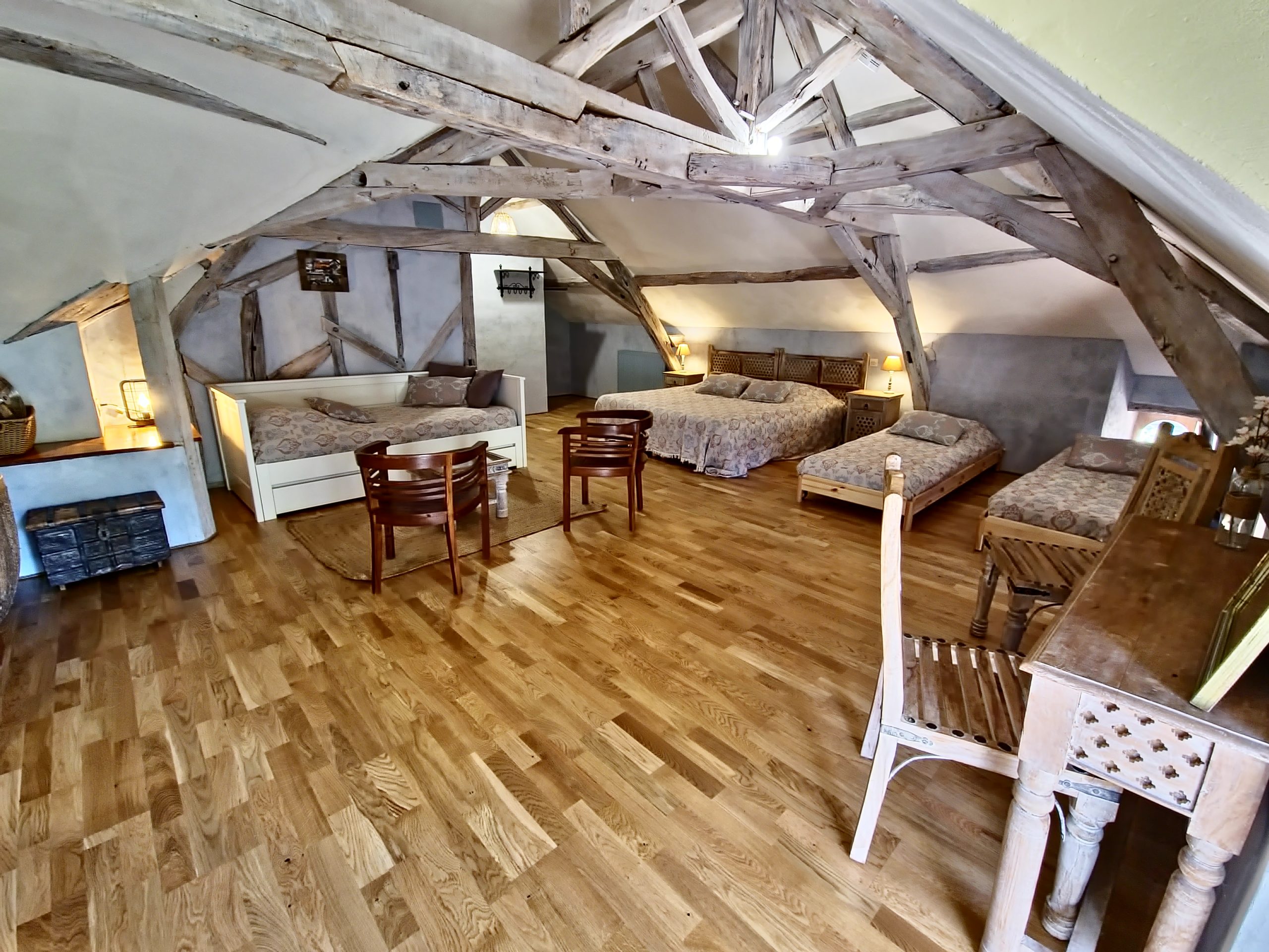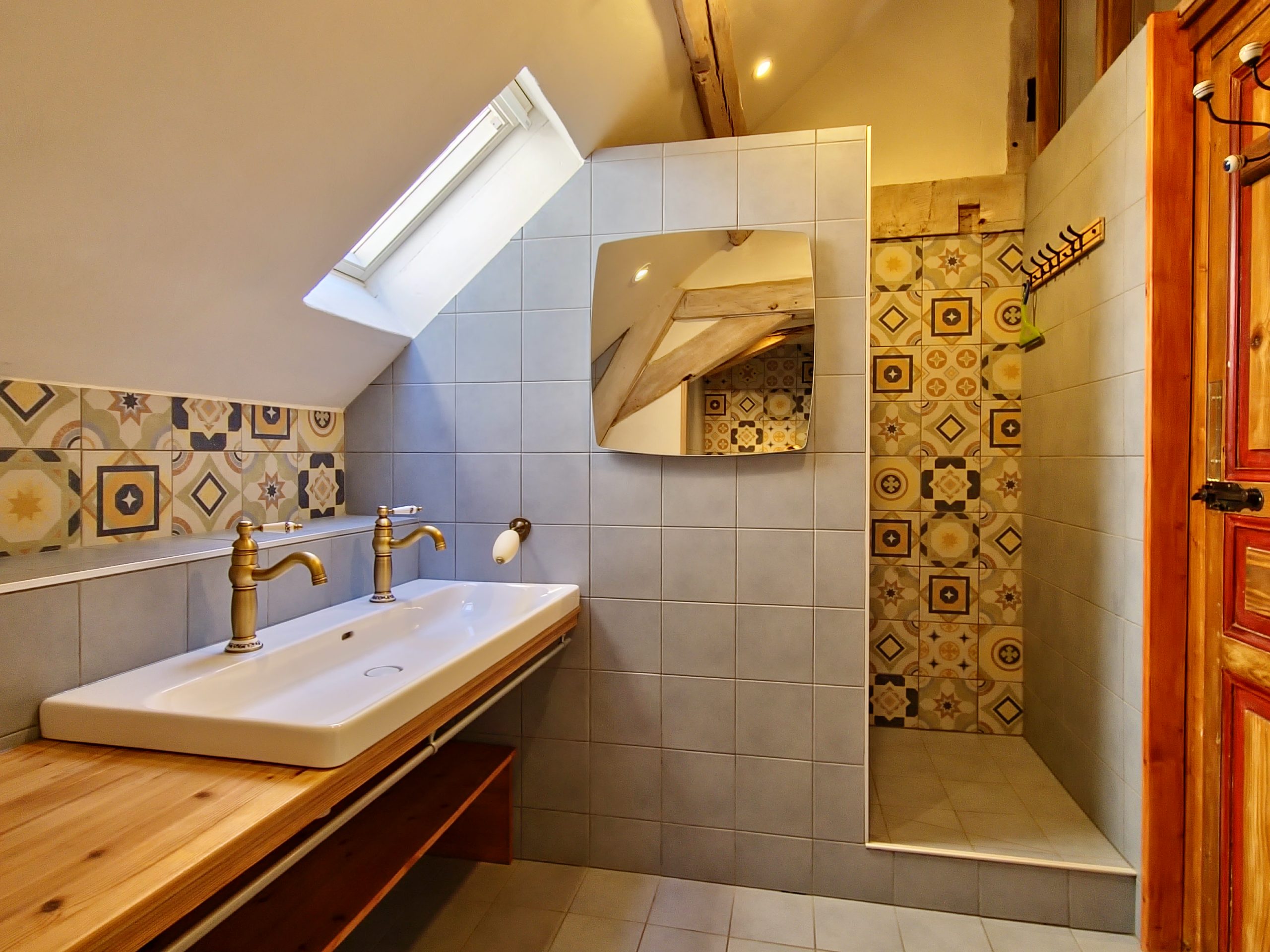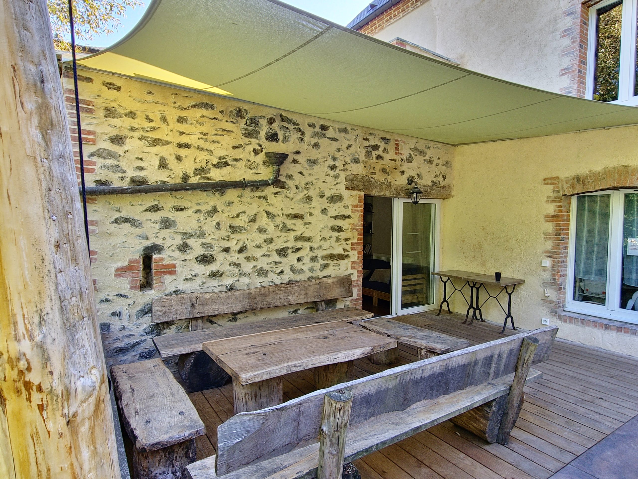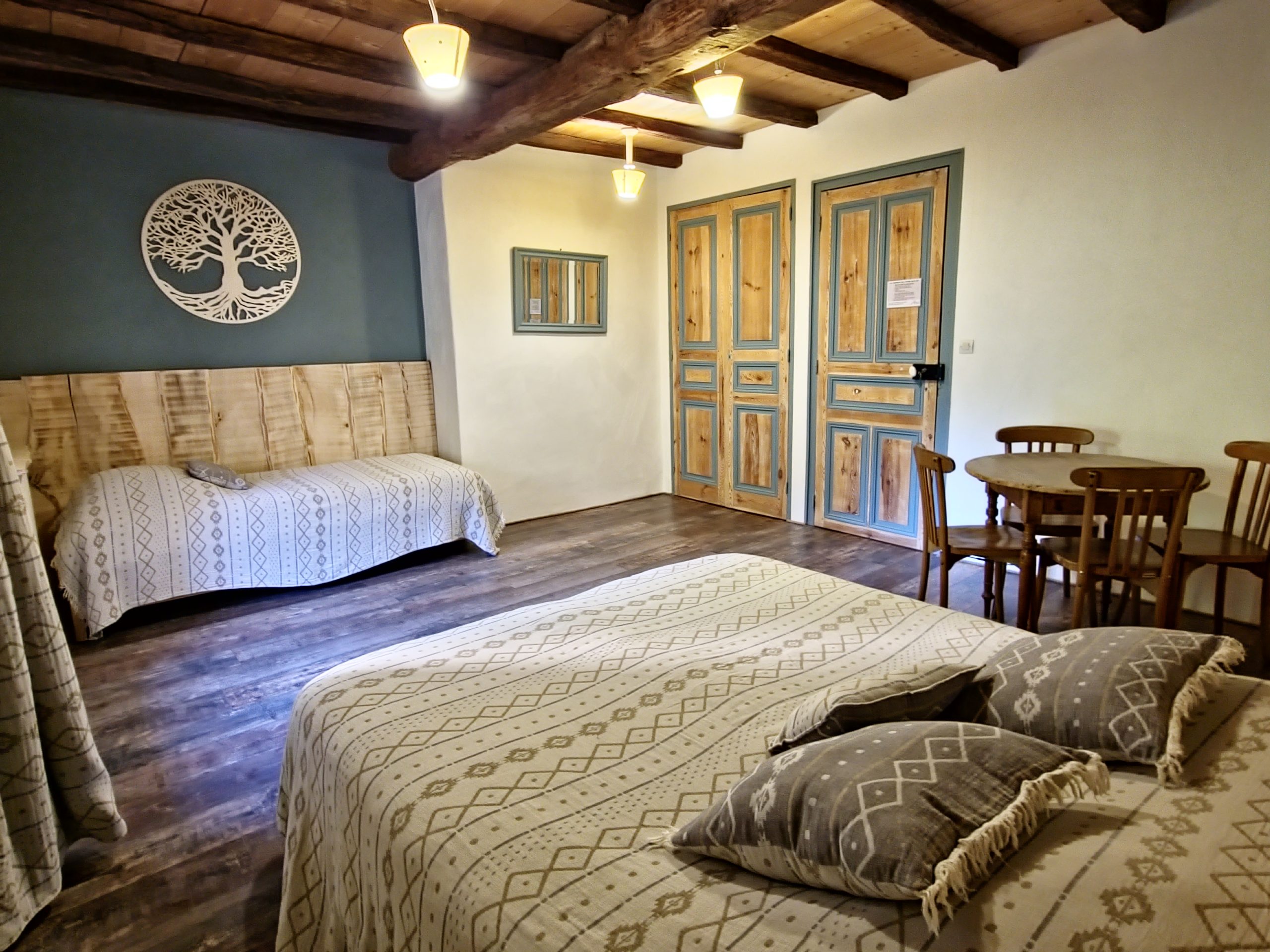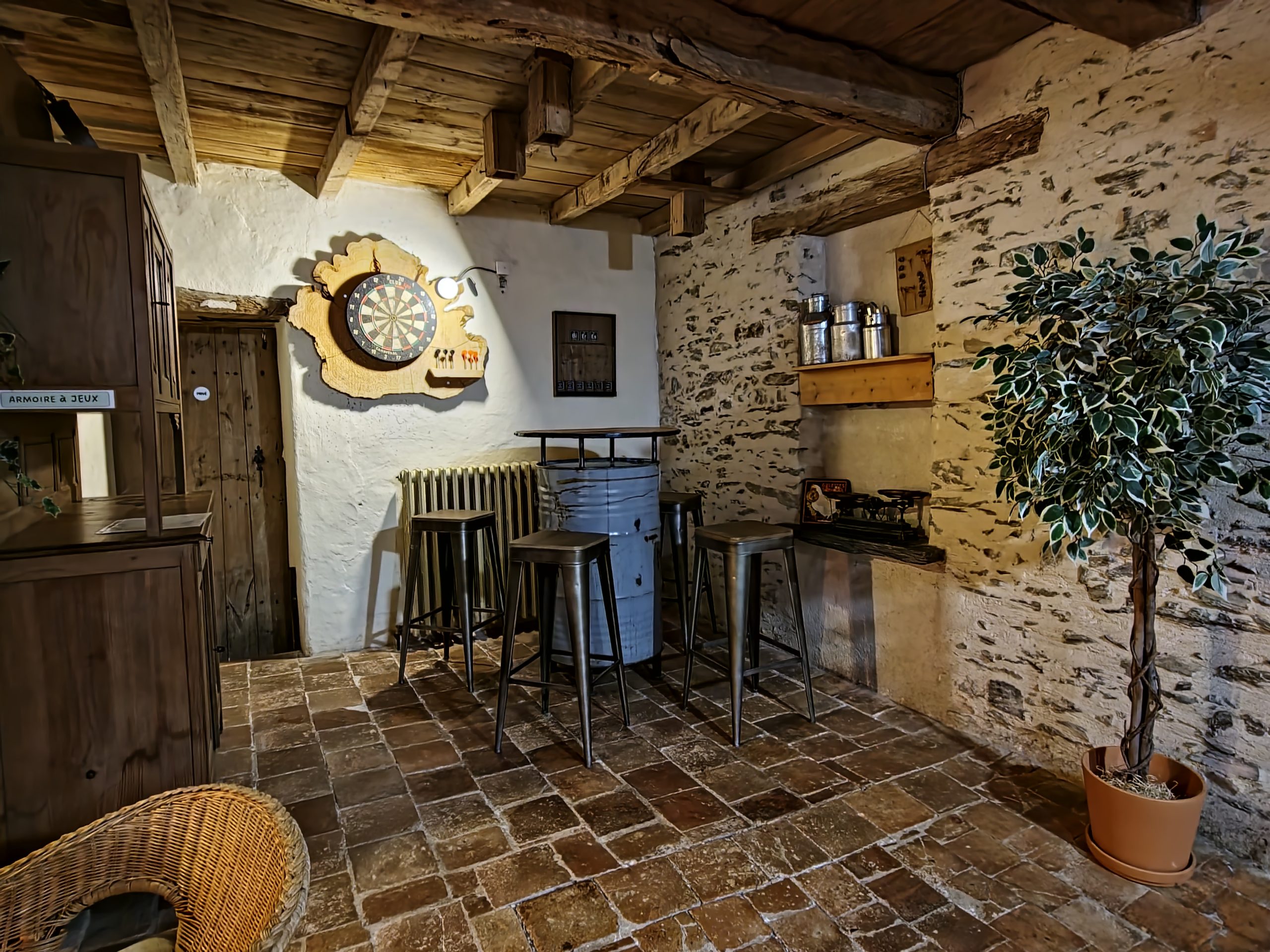 Cet ancien moulin à eau, rénové avec passion a conservé les traces de son passé – meule, trémie, bief et autres éléments participent pleinement à la décoration.